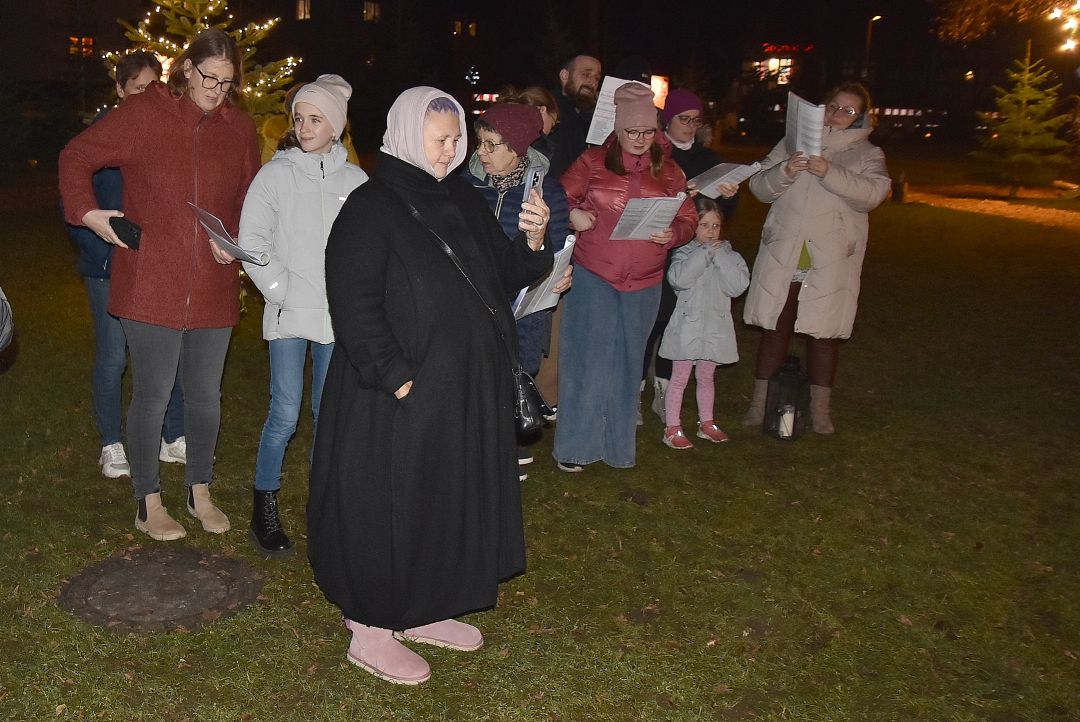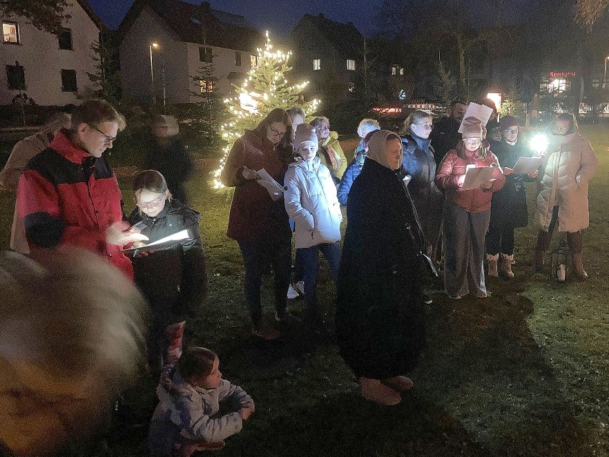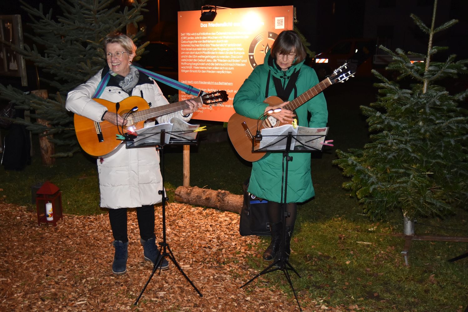 Bevor das Friedenslicht übergeben wurde, stand die 14. Station des Lebendigen Adventskalender im Mittelpunkt. Die Geschichte las Nadine Lenz und Elfriede Möller und Edith Wiegand begleiteten die Lieder auf der Gitarre. Dass der Lebendige Adventskalender, organisiert vom Familiengottesdienstteam, eine gute Tradition ist, zeigen die vielen Kinder mit ihren Eltern, die täglich von Fenster zu Fenster mitgehen und so die Figuren „Josef und Maria auf dem Weg“ bis zur Krippenfeier am Heiligen Abend in der Stiftskirche begleiten.