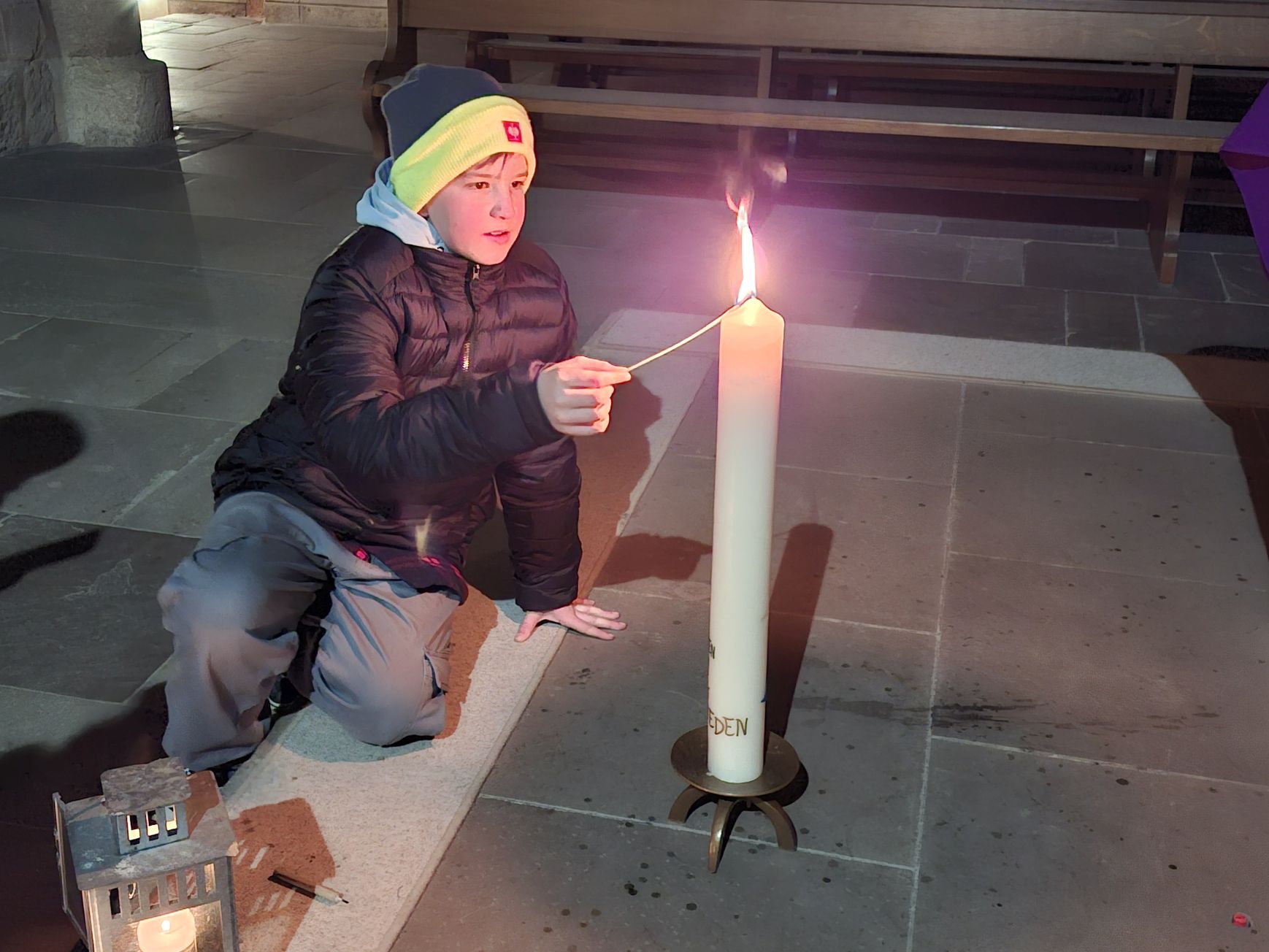 Anton Möller hat mit seiner Mutter Melanie und seinen Großeltern Rita und Reiner Wald in Fulda das Friedenslicht in Empfang genommen und nach Rasdorf gebracht. „Ein Funke Mut“, so das diesjährige Thema, betont die Notwendigkeit, den Frieden in sich selbst zu finden und weiterzugeben. Die Pfadfinderinnen und Pfadfinder der Deutschen Pfadfinderschaft Sankt Georg im Bistum Fulda (DPSG) und der Verband Christlicher Pfadfinderinnen und Pfadfinder in der Landeskirche Kurhessen-Waldeck (VCP) übergaben es in einem ökumenischen Gottesdienst im Fuldaer Dom.