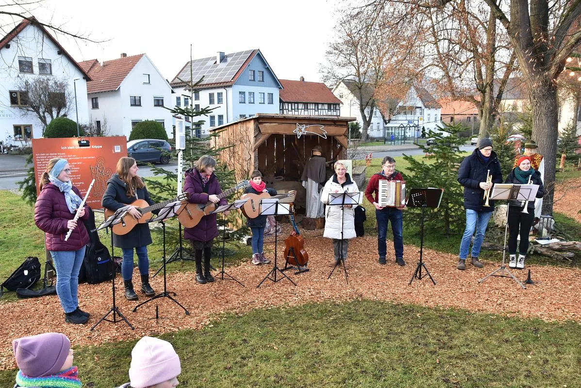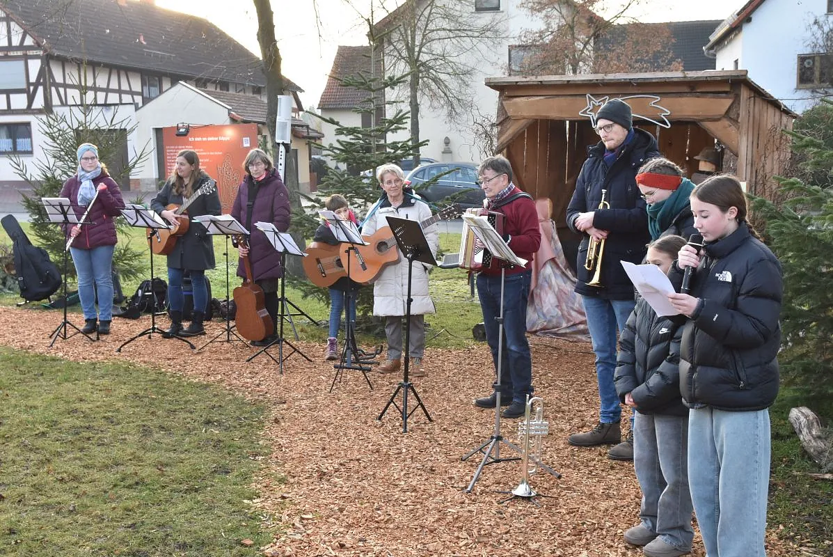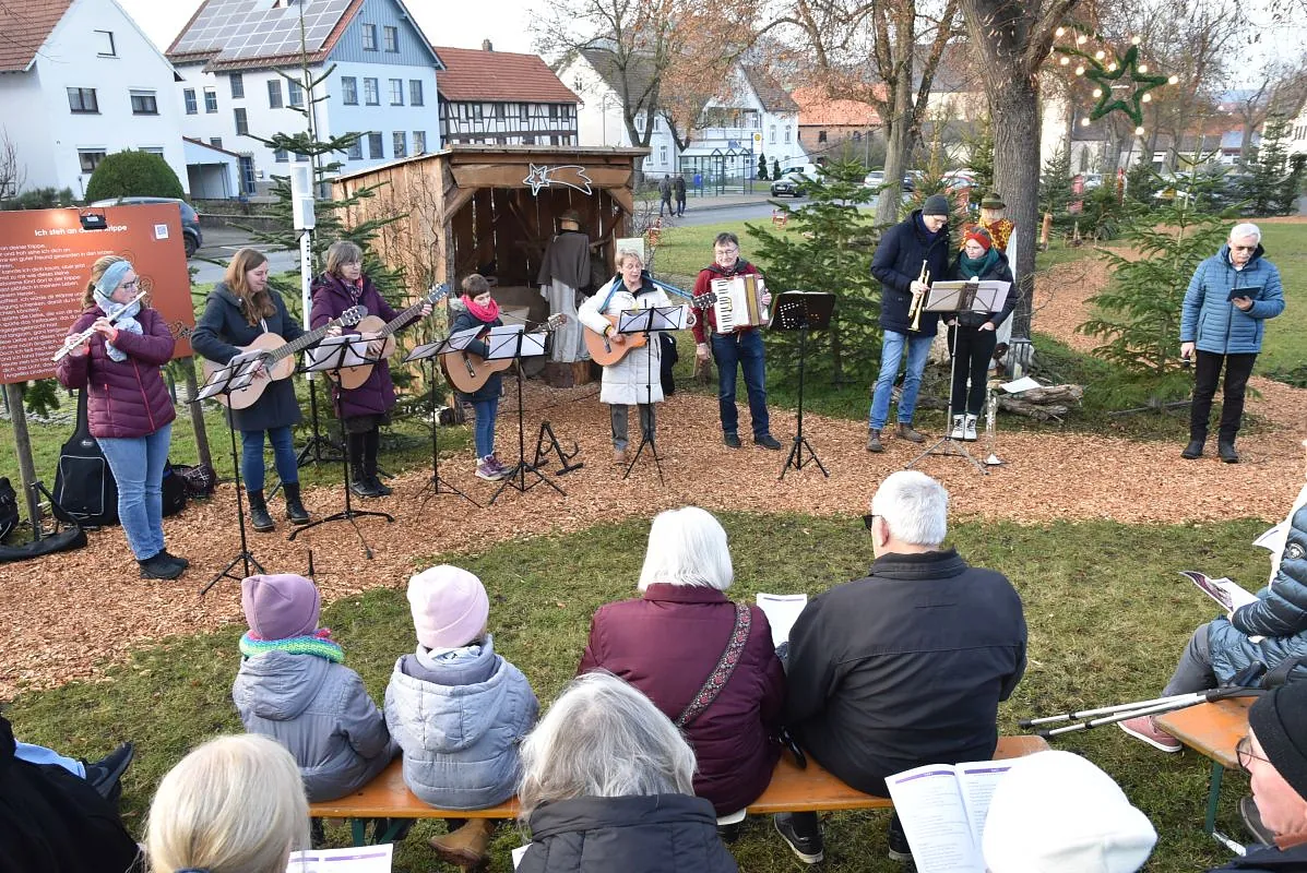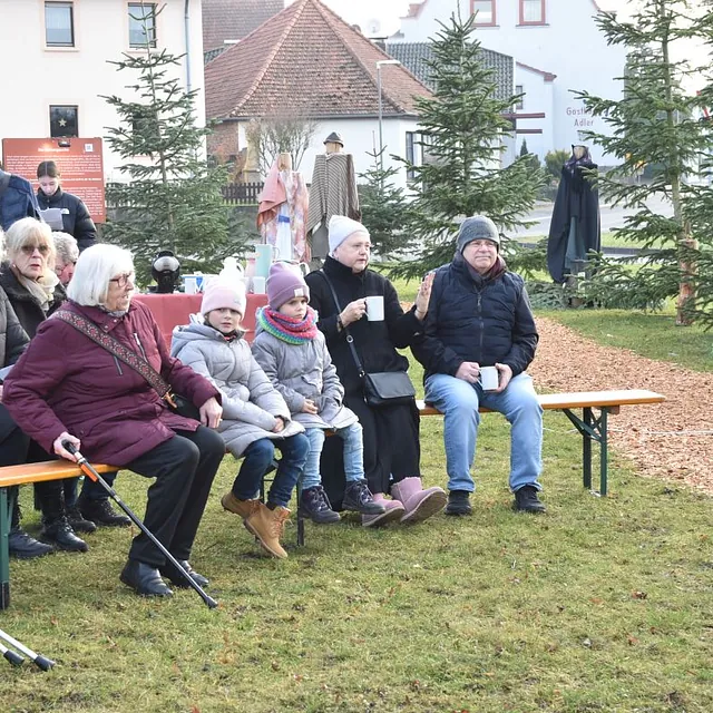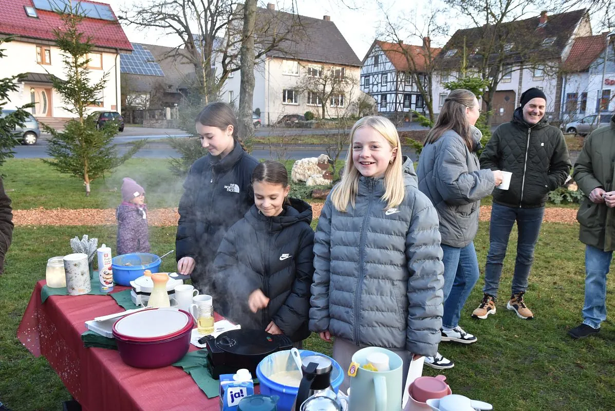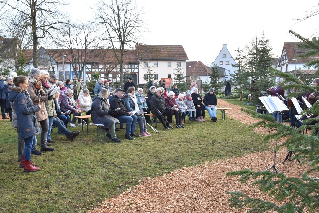 Ein „Offenen Singen“ gab es nicht nur auf dem Fuldaer Domplatz, sondern auch auf dem Rasdorfer Adventsweg. Bei kühlem, aber sonnigen Wetter hatten sich ca. 100 Menschen jeden Alters eingefunden. Elfriede Möller hatte adventlichen Lieder zusammengestellt und Theo Lenz daraus ein Liedheft gemacht. Außerdem hatte er für Technik und Sitzbänke gesorgt. Letztere waren alle besetzt und viele der Mitsingenden mussten stehen. Der Gesang wurde musikalisch begleitet (Leitung Elfriede Möller) von Querflöte (Celina Wieber), Gitarren (Christina Weber, Edith Wiegand, Emma Thornagel, Elfriede Möller), Akkordeon (Georg Jäger) und Trompeten (Johannes und Elisabeth Balzer). Es erklangen Lieder wie „Macht hoch die Tür; Im Advent ist ein Licht erwacht; Morgen Kinder wird´s was geben und Tochter Zion“. Natürlich durften „O Tannenbaum und Alle Jahre wieder“ nicht fehlen. Weihnachtlich wurde es am Schluss mit „o du fröhliche“. Mariann Bohlen und Nele Fladung mit Lina Sauerbier trugen die weihnachtlichen Geschichten „Ungewöhnliche Geschenke und Warum Gott Mensch wurde“ vor, die ob ihres Inhalts einen tiefen Eindruck machten. Das „offene Singen“ wurde mit dem Angebot von Waffeln, Kaffee und Tee beendet. Das Familiengottessdienstteam hatte alle Hände voll zu tun, um die Nachfragenden zu bedienen. Damit genug Teig vorhanden war, hatten Nele Fladung und Mariann Bohlen zuhause schon ordentlich vorgearbeitet. Ebenso waren Tee- und Kaffeespenden reichlich da und taten bei der kühlen Witterung gut. Wer wollte konnte eine Spende für den Rasdorfer Adventsweg geben.