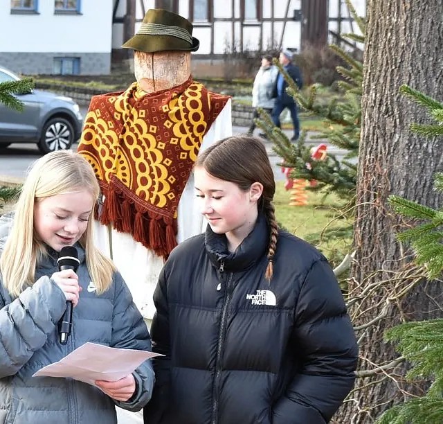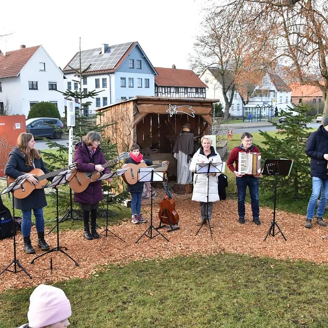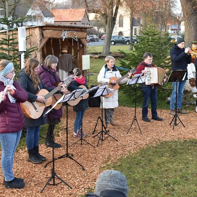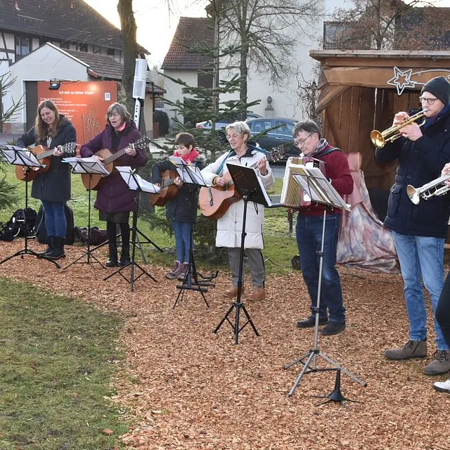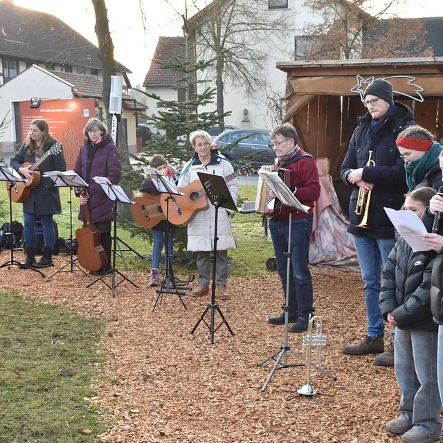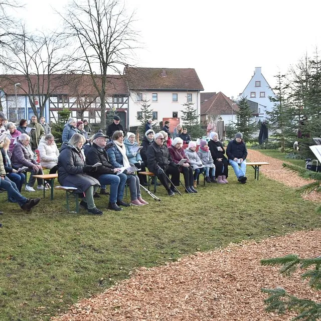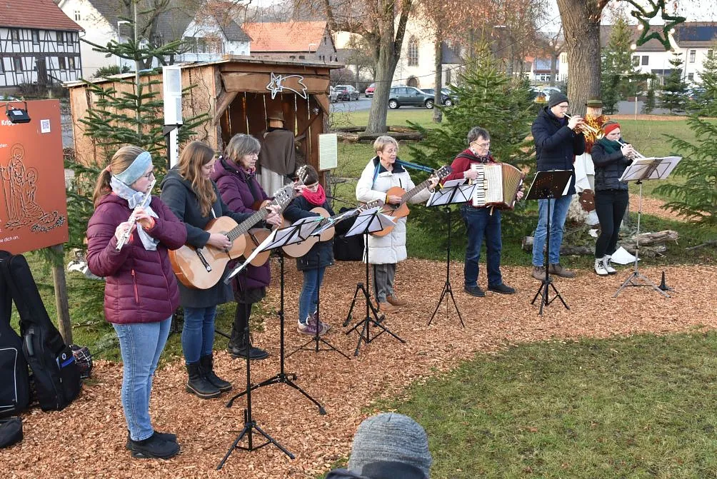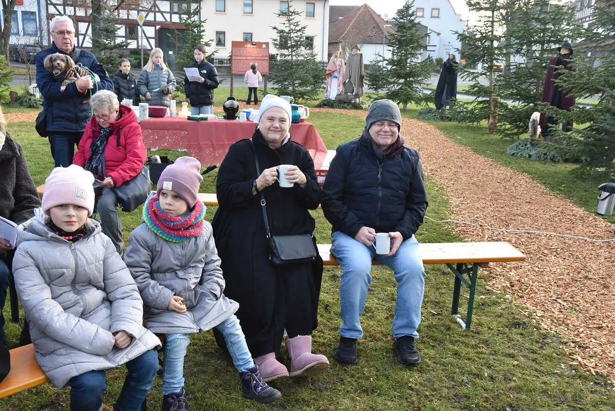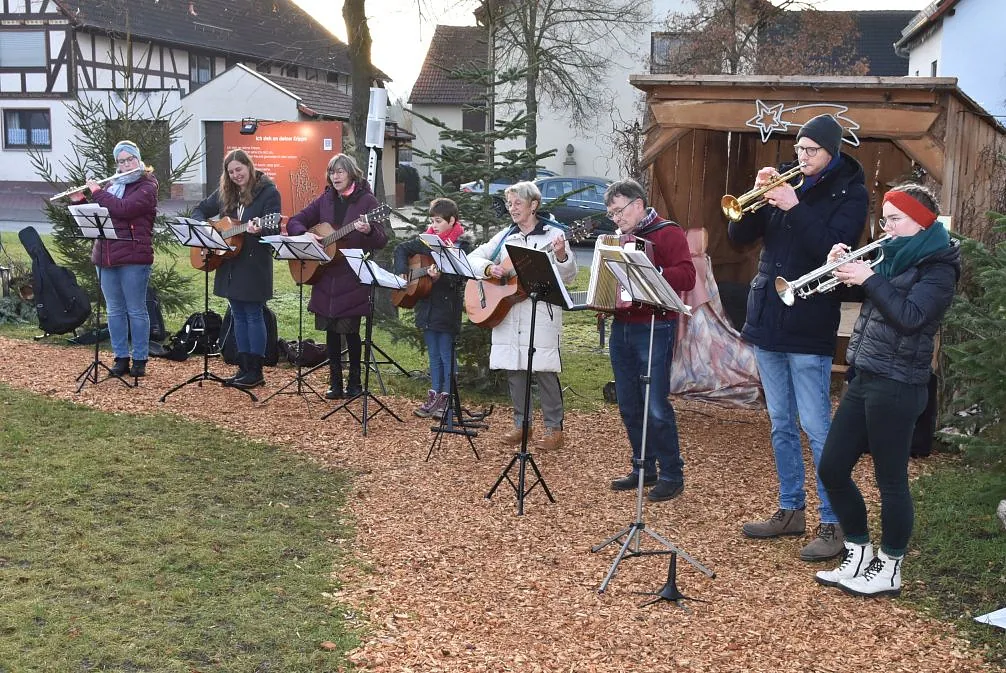 Ein „Offenen Singen“ gab es nicht nur auf dem Fuldaer Domplatz, sondern auch auf dem Rasdorfer Adventsweg. Bei kühlem, aber sonnigen Wetter hatten sich ca. 100 Menschen jeden Alters eingefunden. Elfriede Möller hatte adventlichen Lieder zusammengestellt und Theo Lenz daraus ein Liedheft gemacht. Außerdem hatte er für Technik und Sitzbänke gesorgt. Letztere waren alle besetzt und viele der Mitsingenden mussten stehen. Der Gesang wurde musikalisch begleitet (Leitung Elfriede Möller) von Querflöte (Celina Wieber), Gitarren (Christina Weber, Edith Wiegand, Emma Thornagel, Elfriede Möller), Akkordeon (Georg Jäger) und Trompeten (Johannes und Elisabeth Balzer). Es erklangen Lieder wie „Macht hoch die Tür; Im Advent ist ein Licht erwacht; Morgen Kinder wird´s was geben und Tochter Zion“. Natürlich durften „O Tannenbaum und Alle Jahre wieder“ nicht fehlen. Weihnachtlich wurde es am Schluss mit „o du fröhliche“. Mariann Bohlen und Nele Fladung mit Lina Sauerbier trugen die weihnachtlichen Geschichten „Ungewöhnliche Geschenke und Warum Gott Mensch wurde“ vor, die ob ihres Inhalts einen tiefen Eindruck machten. Das „offene Singen“ wurde mit dem Angebot von Waffeln, Kaffee und Tee beendet. Das Familiengottessdienstteam hatte alle Hände voll zu tun, um die Nachfragenden zu bedienen. Damit genug Teig vorhanden war, hatten Nele Fladung und Mariann Bohlen zuhause schon ordentlich vorgearbeitet. Ebenso waren Tee- und Kaffeespenden reichlich da und taten bei der kühlen Witterung gut. Wer wollte konnte eine Spende für den Rasdorfer Adventsweg geben.